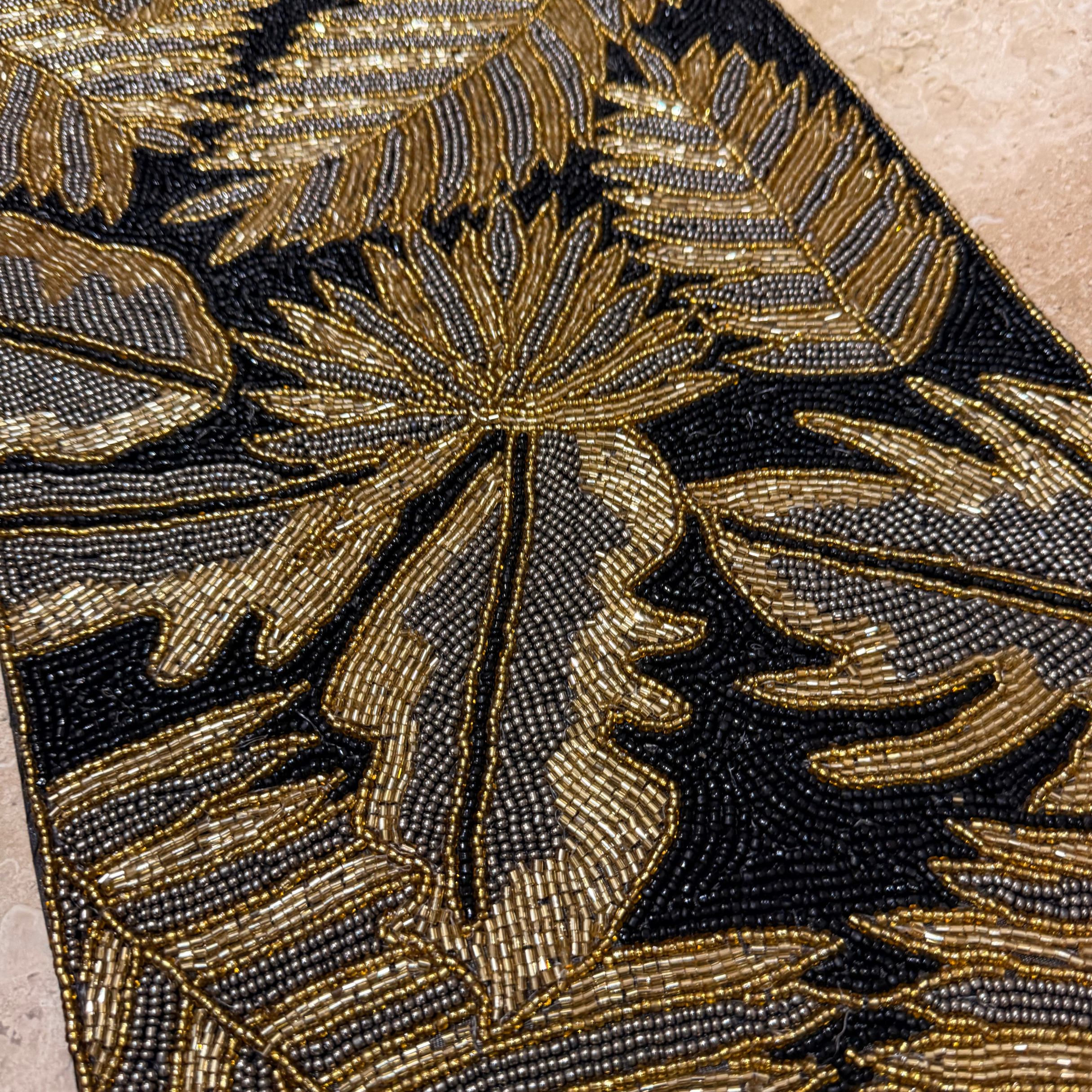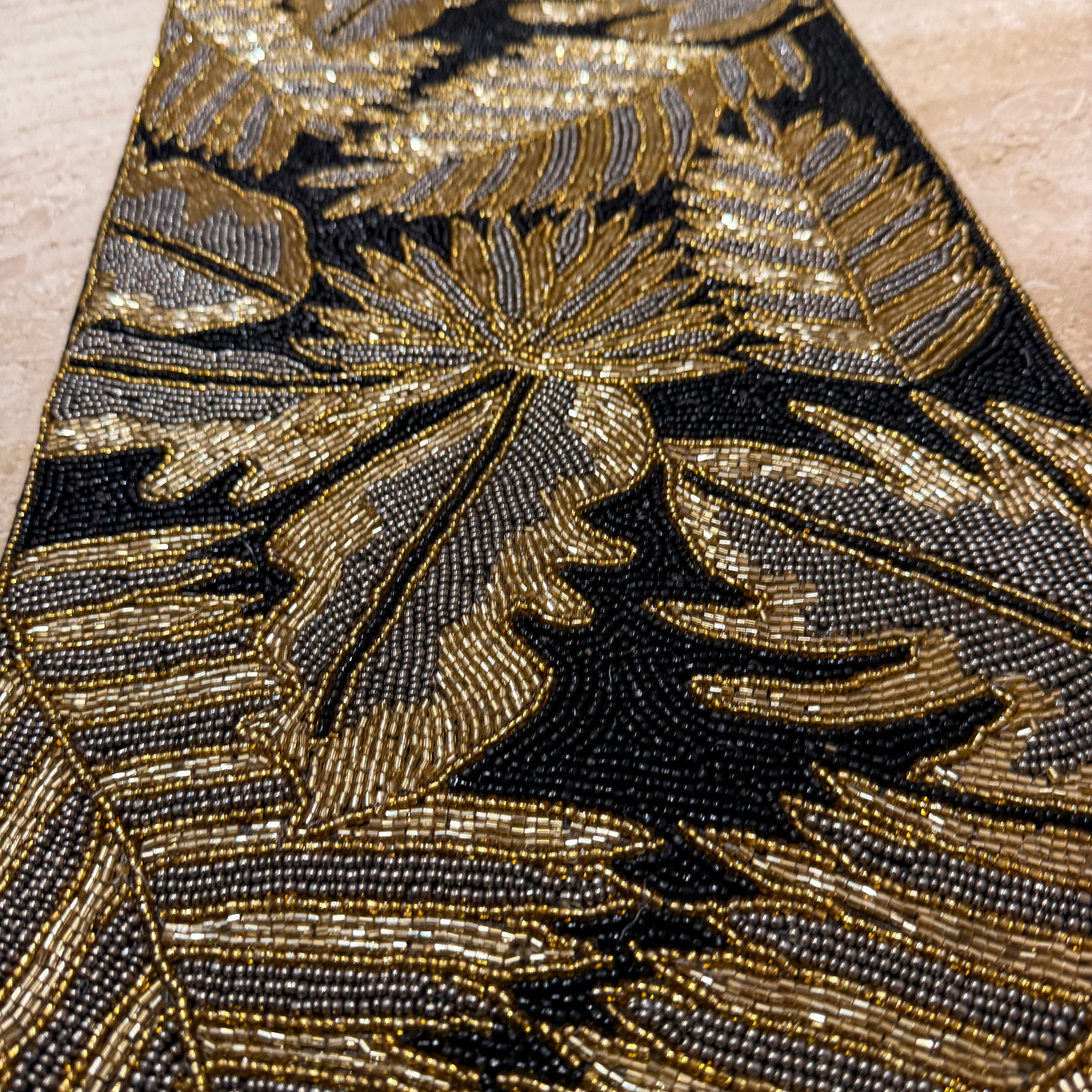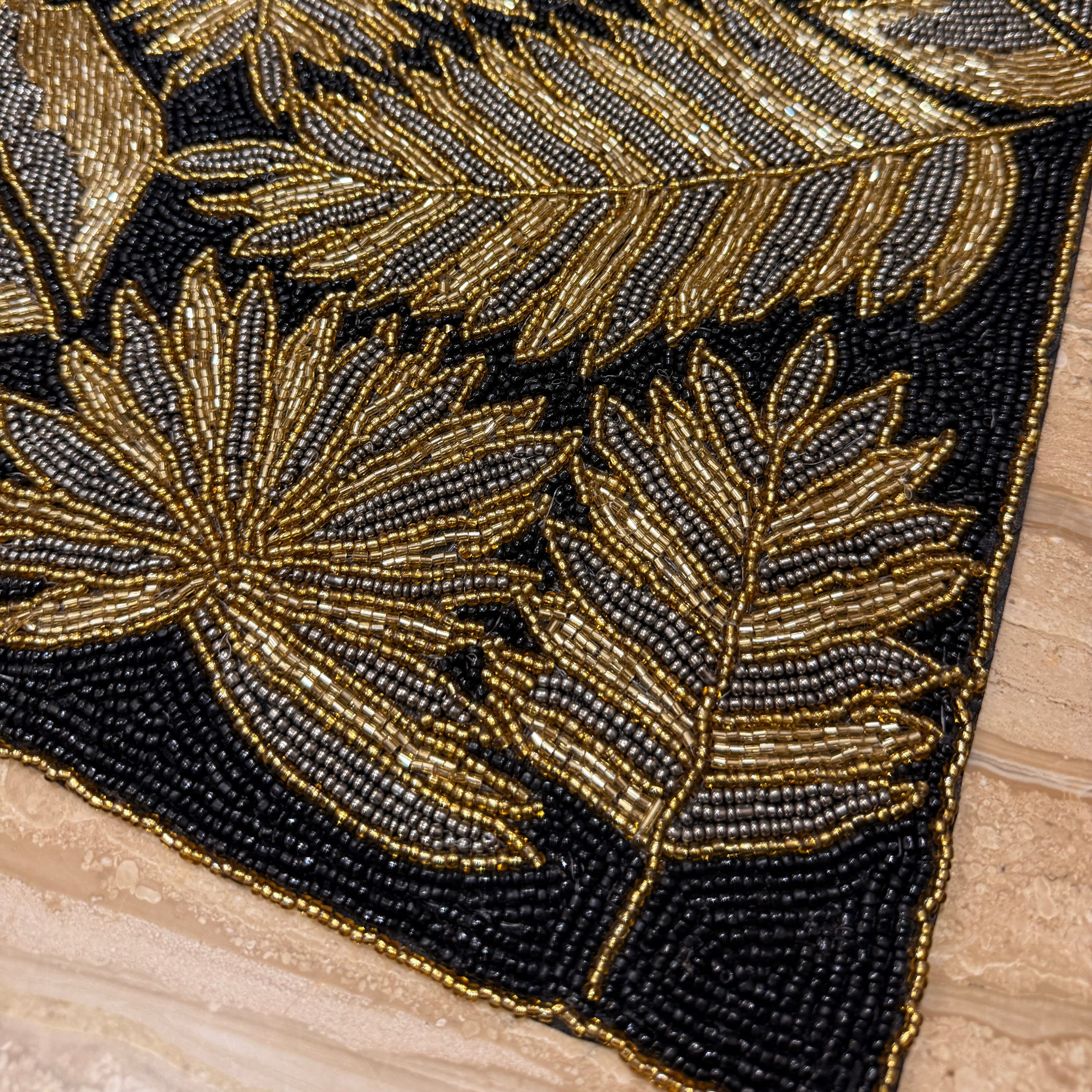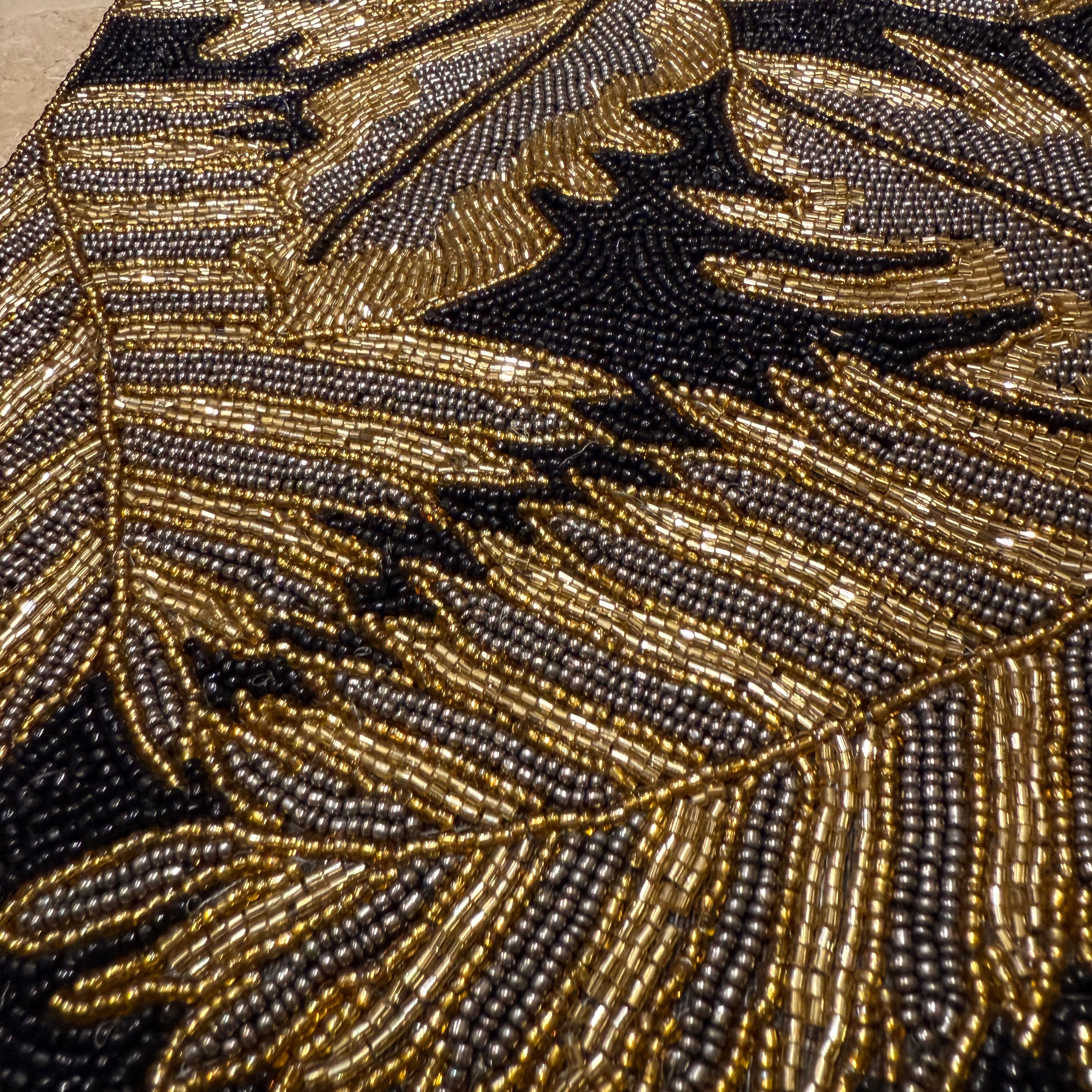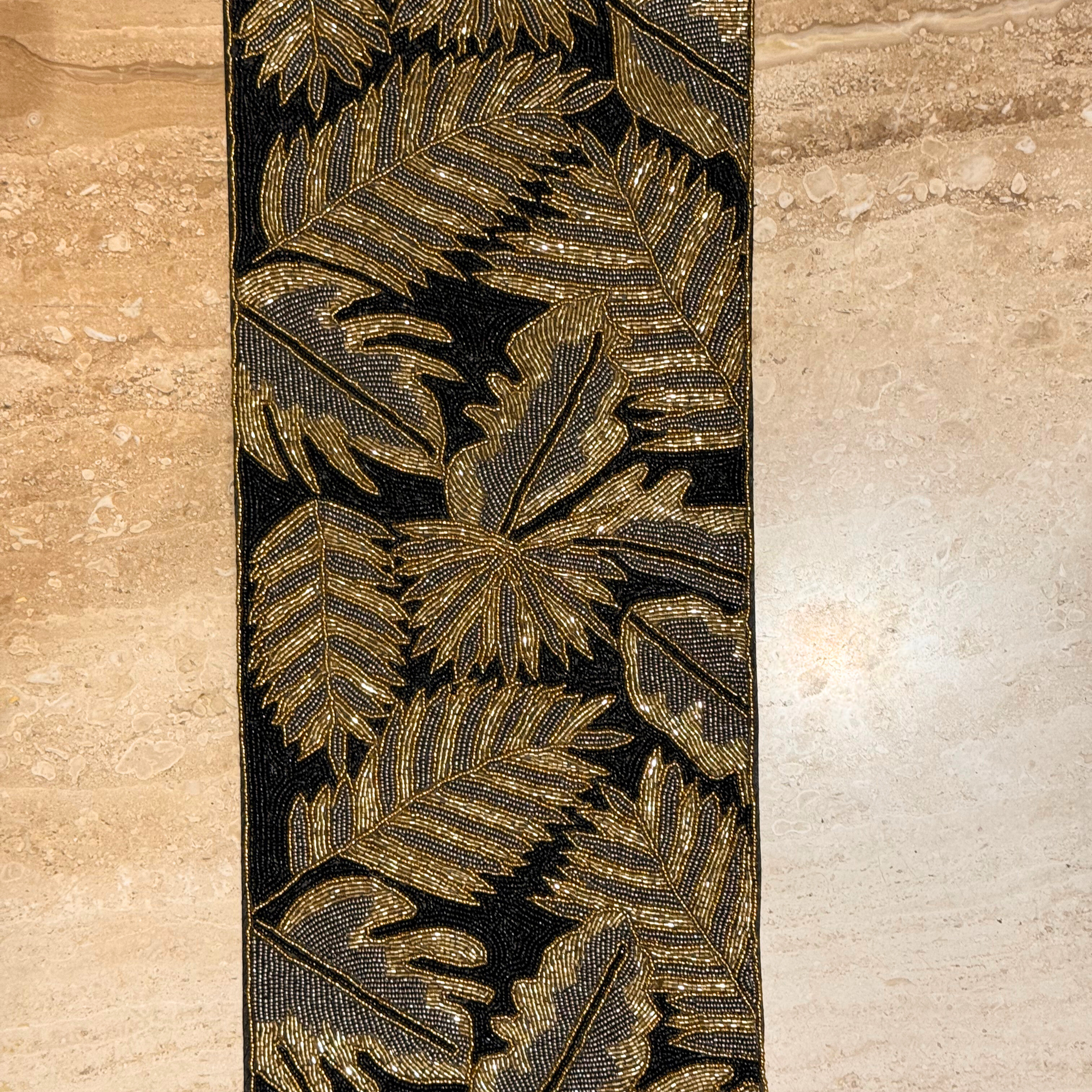 Add a burst of elegance and artistry to your table with this aesthetic black and gold beaded table runner. Featuring copper, gold leaves , this handcrafted piece is designed with precision beadwork that catches the light beautifully.