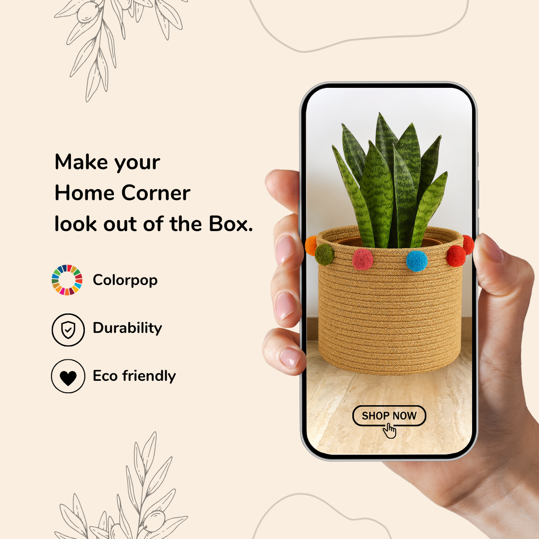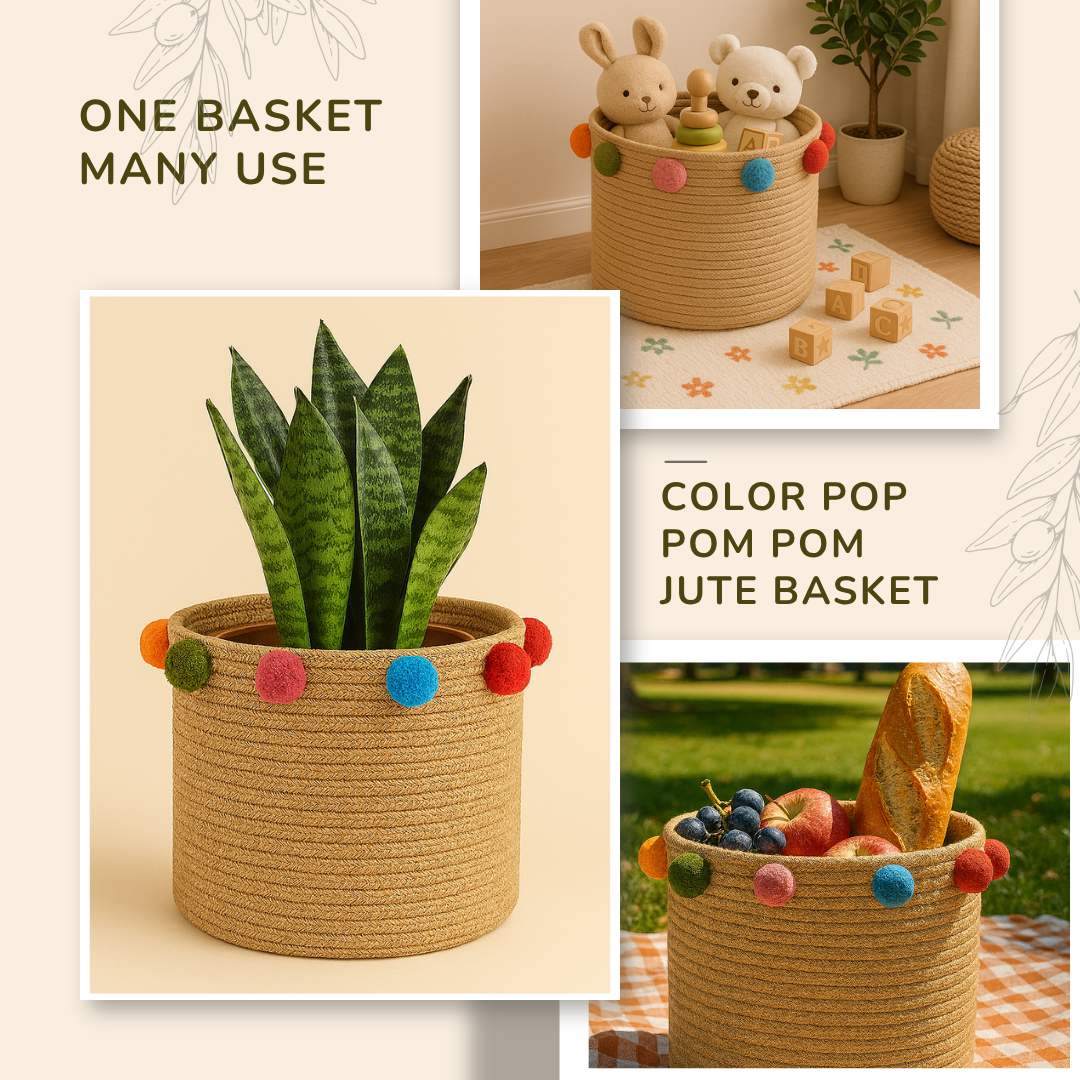 Add an instant pop of fun to your space with the Color Pop Jute Basket! Adorned with handcrafted multicolored pom poms made from soft cotton wool, this playful storage basket turns everyday organizing into something bright and beautiful. Each pom pom is carefully made by skilled artisans, giving the basket its one-of-a-kind, joyful personality.