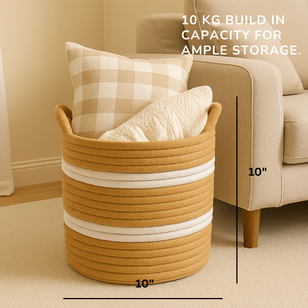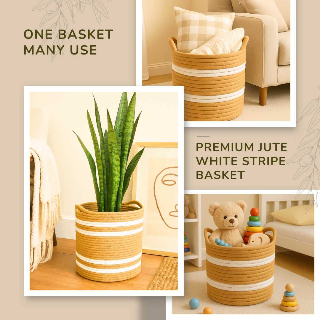 Add warmth and function to your home with this beautifully handcrafted jute rope basket. Designed in a natural earthy tone with neat white stripes, this basket is the perfect mix of practical storage and timeless décor.