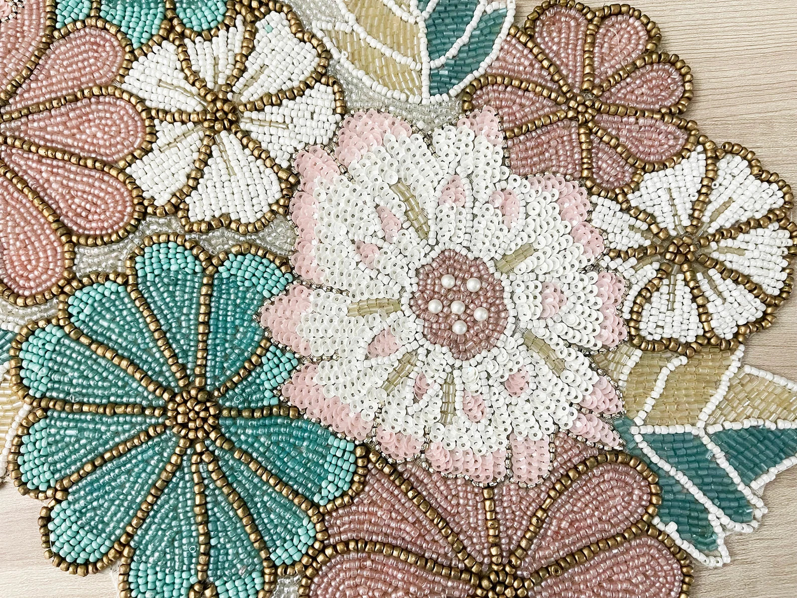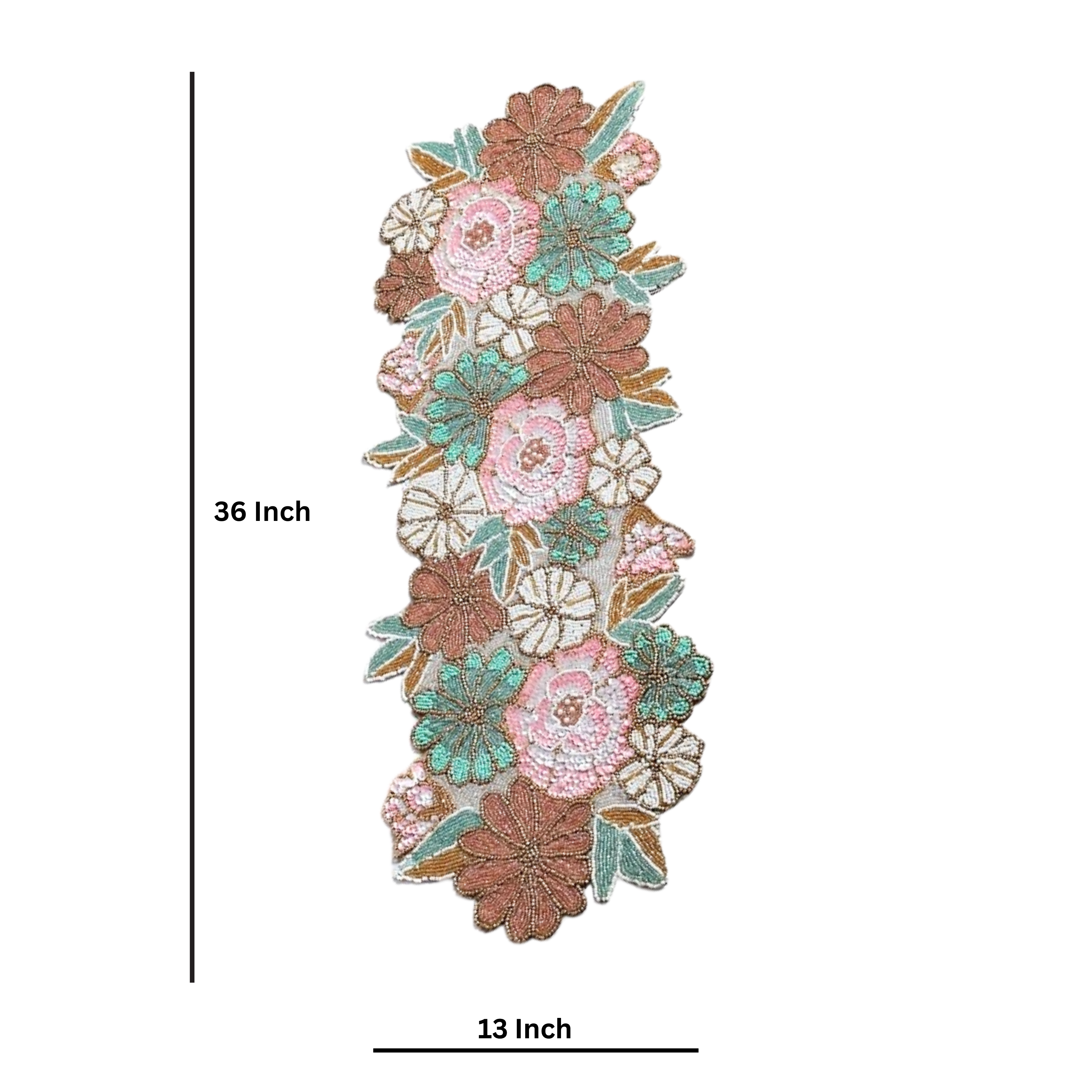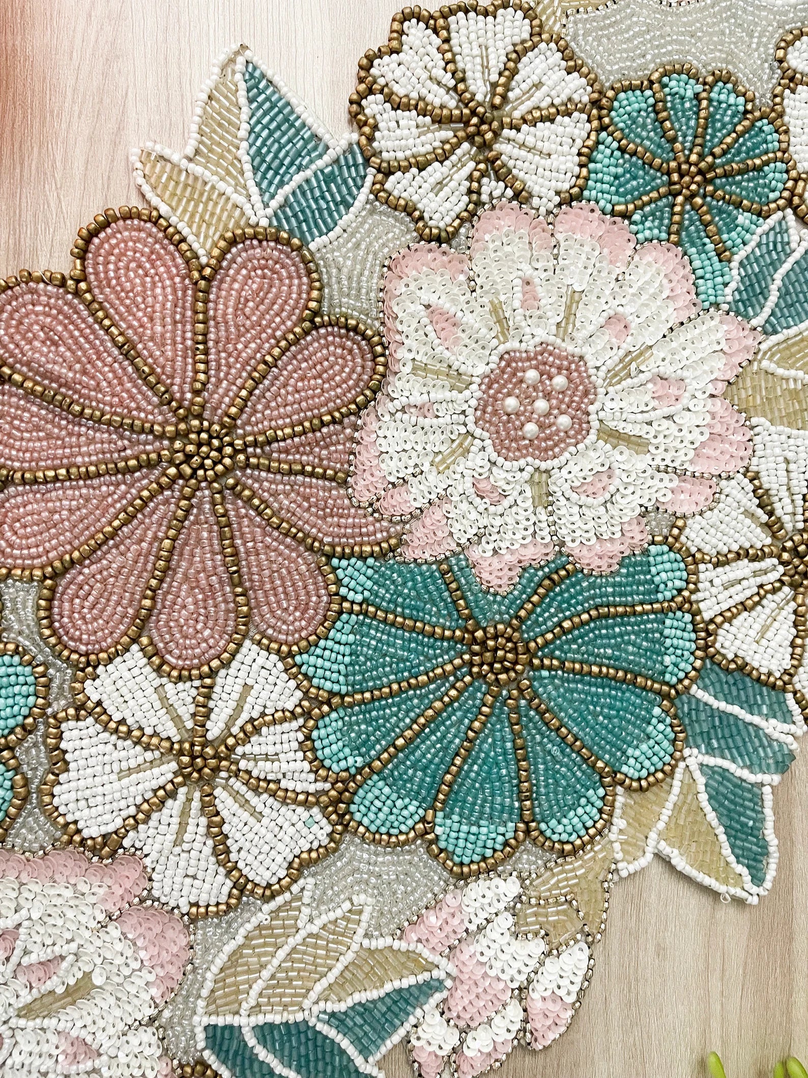 Elevate your table décor with this pastel floral beaded runner, delicately handcrafted with intricate beadwork. Featuring soft hues of blush pink, teal, ivory, and gold accents, this runner exudes elegance and charm. Its scalloped floral design makes it a standout piece for dining tables, consoles, or festive setups.
