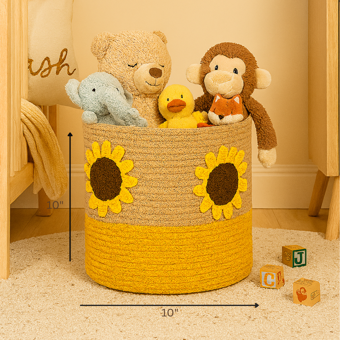 Brighten your space with the Sunny Bloom Jute Basket—a joyful blend of tradition, texture, and craft. This handwoven beauty features 4 handknitted sunflowers, crafted using the ancient art of crochet weaving. These 3D elevated sunflowers add depth, charm, and a pop of personality to the natural jute base—bringing the warmth of the outdoors inside your home.