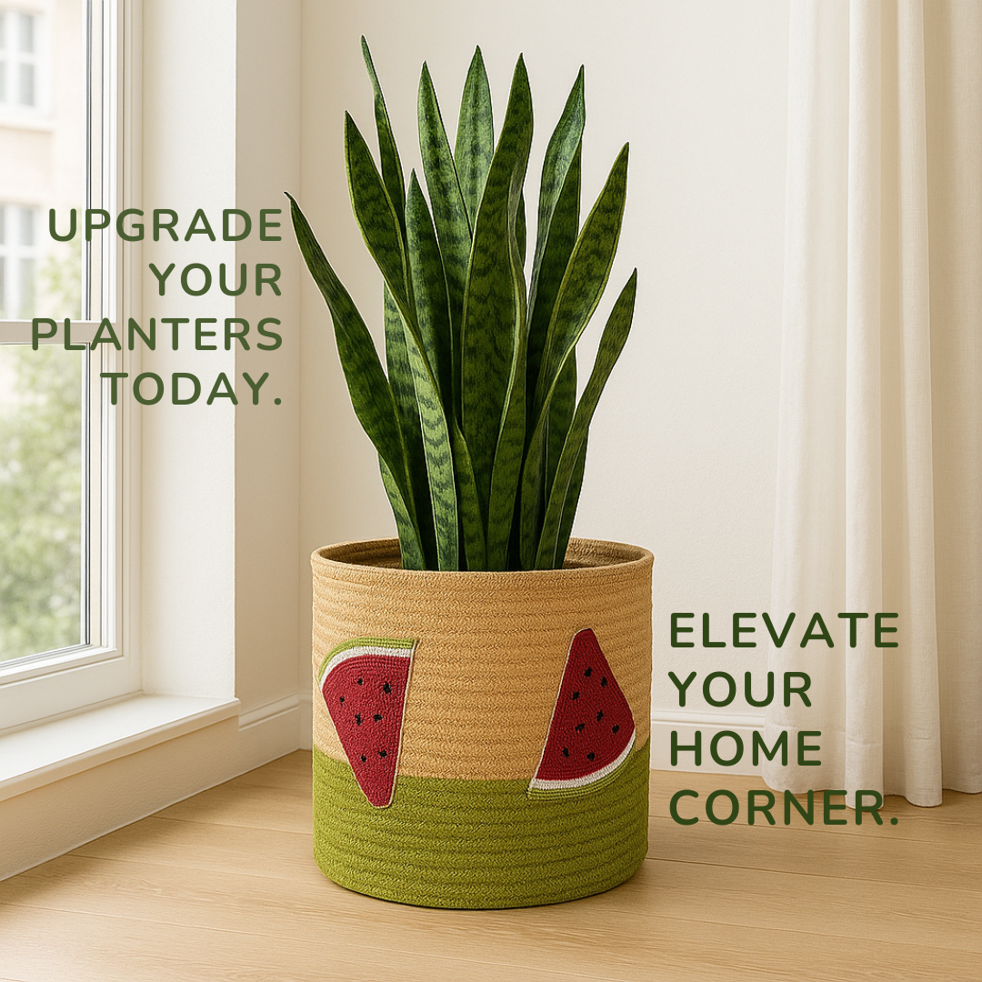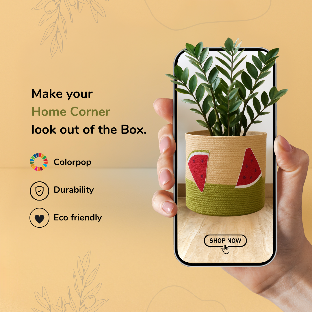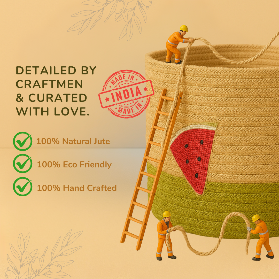 Add a slice of joy to your space with this vibrant, handcrafted jute basket featuring a playful watermelon theme. Made entirely from natural jute and woven using traditional Indian techniques, the basket stands out with four beautifully embellished watermelon slices—each one handcrafted using sequins, pipes, thread, and stones by skilled artisans.