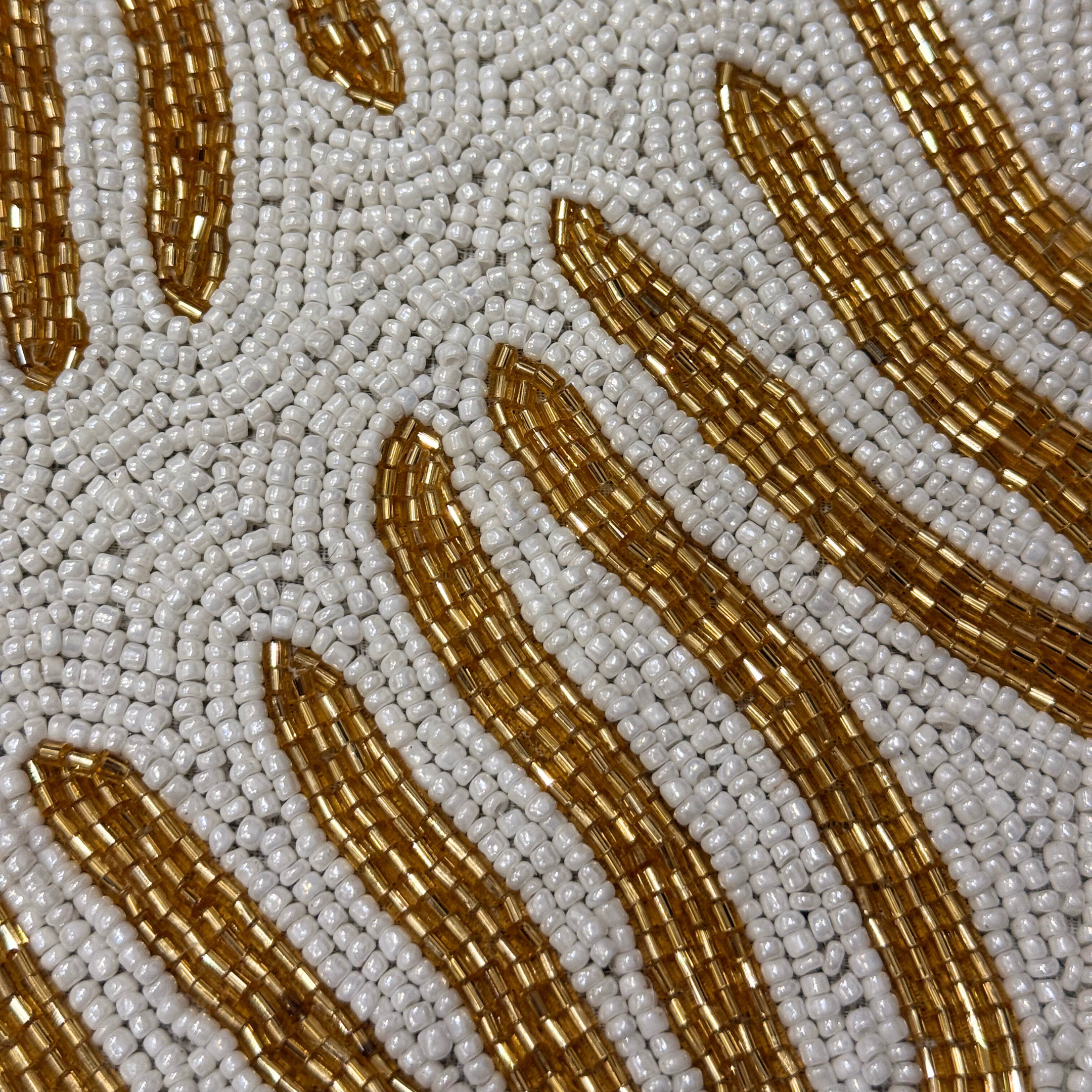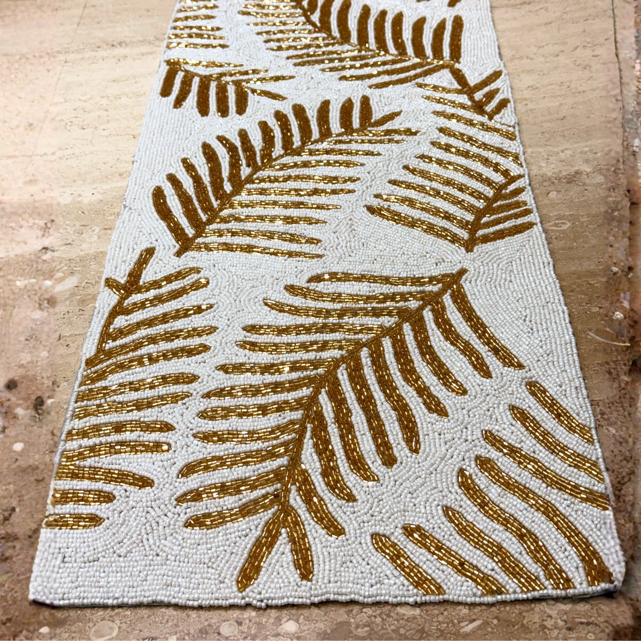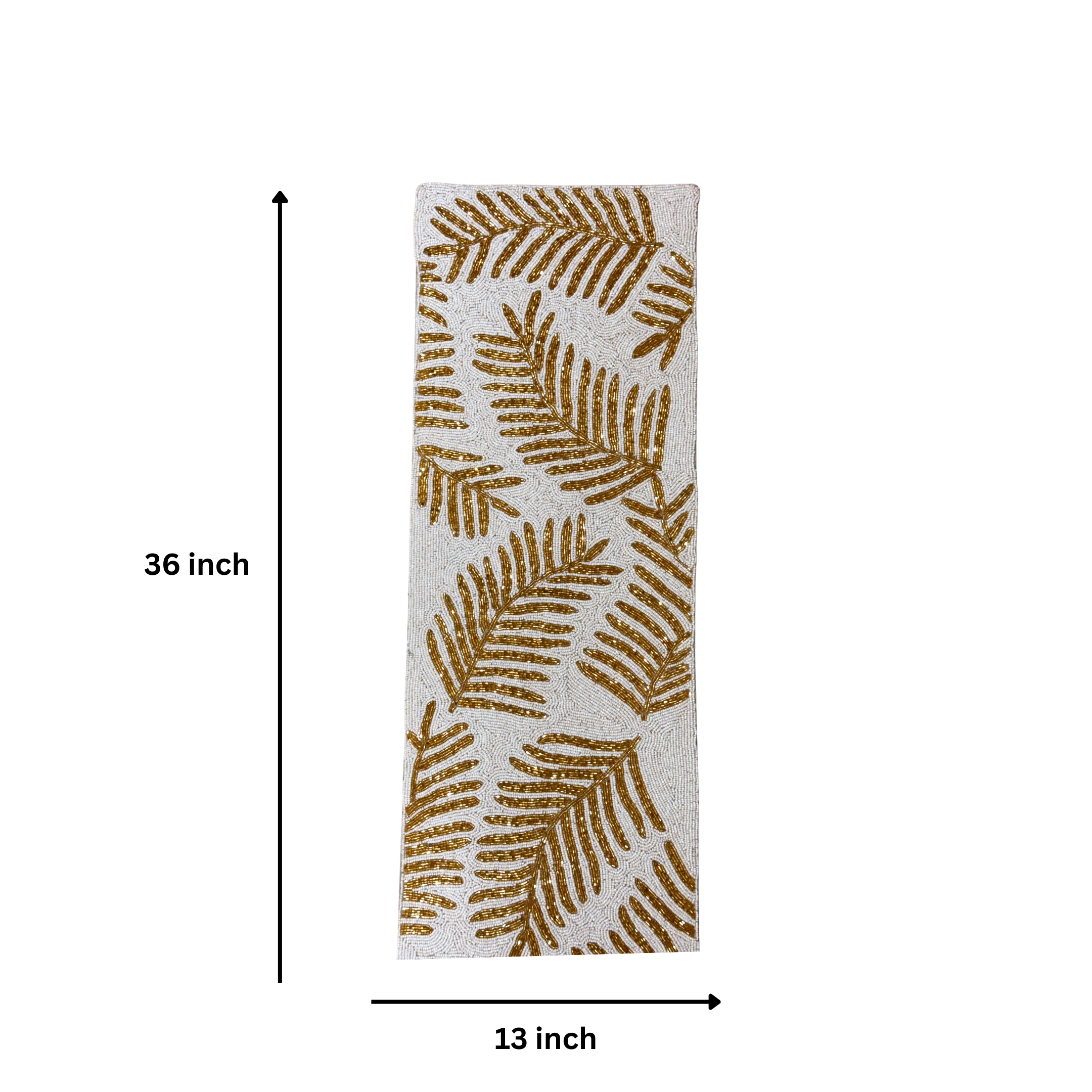 Add a burst of elegance and artistry to your table with this aesthetic white and gold beaded table runner. Featuring copper, gold leaves , this handcrafted piece is designed with precision beadwork that catches the light beautifully.