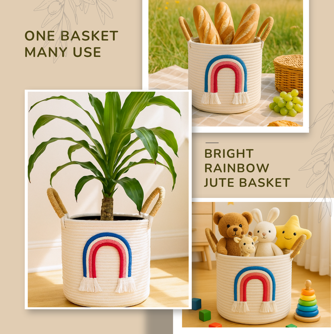 Its neutral base and warm-toned rainbow design make it perfect for nurseries, reading corners, playrooms, or boho-chic living spaces. Lightweight yet sturdy, this multipurpose basket effortlessly fits into conscious, cozy homes.