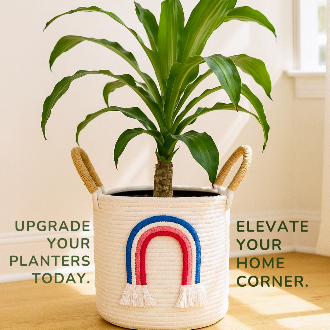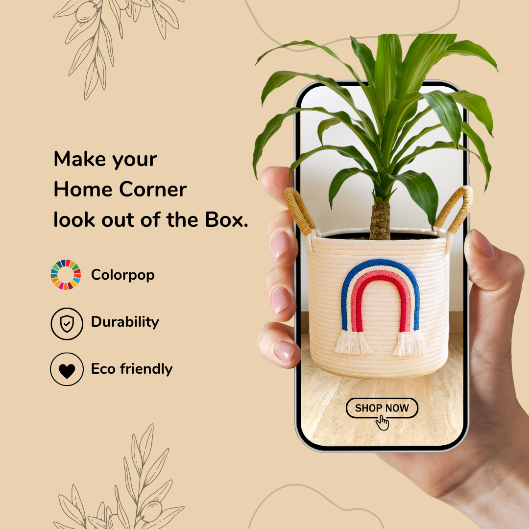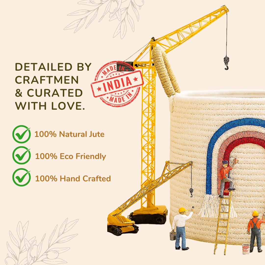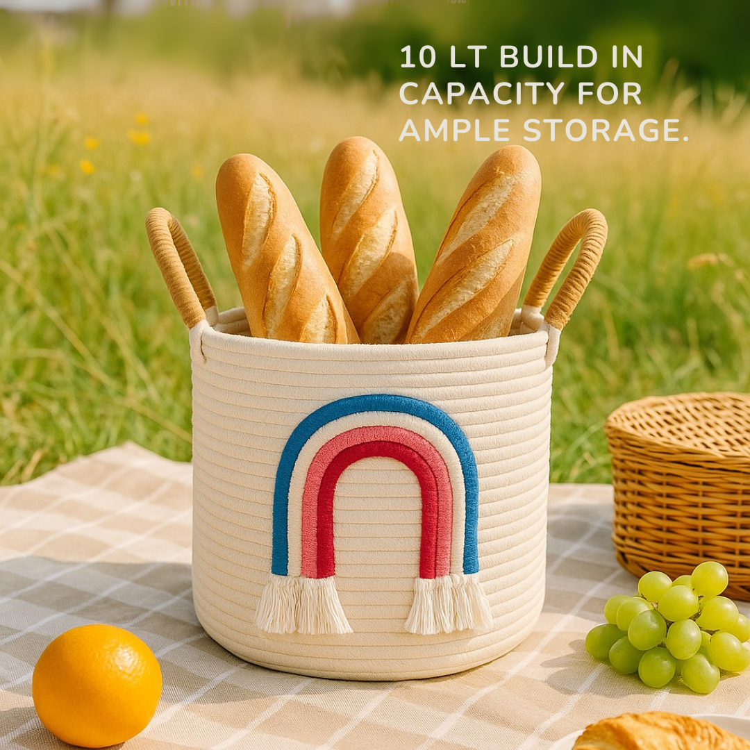 Add a touch of playful charm and earthy warmth to your home with this handwoven cotton knitted basket, designed with a beautiful rainbow applique. Handcrafted by Indian artisans, this basket blends soft, durable cotton with traditional rope weaving techniques—creating a unique piece that balances aesthetic charm with everyday practicality.