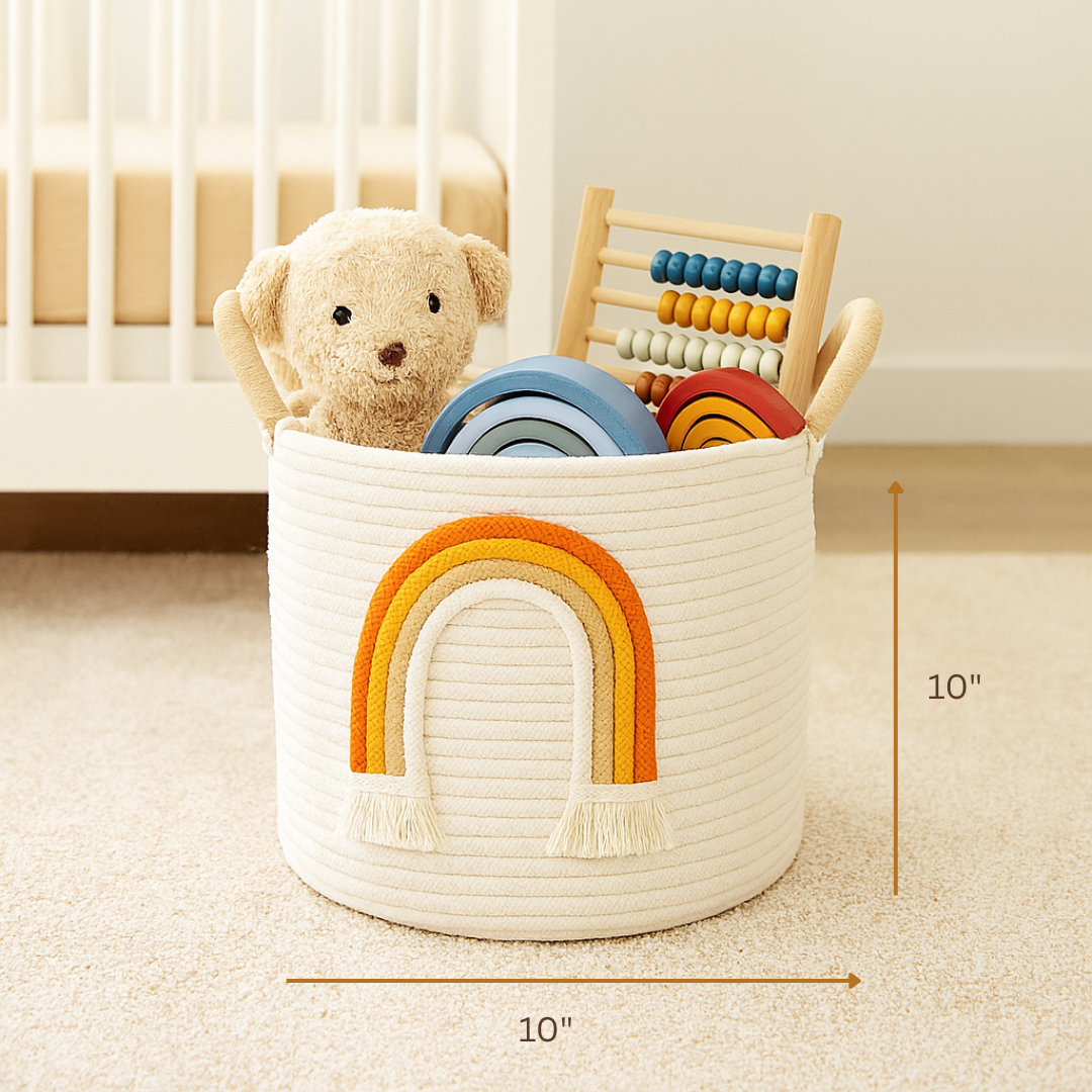 Its neutral base and warm-toned rainbow design make it perfect for nurseries, reading corners, playrooms, or boho-chic living spaces. Lightweight yet sturdy, this multipurpose basket effortlessly fits into conscious, cozy homes.