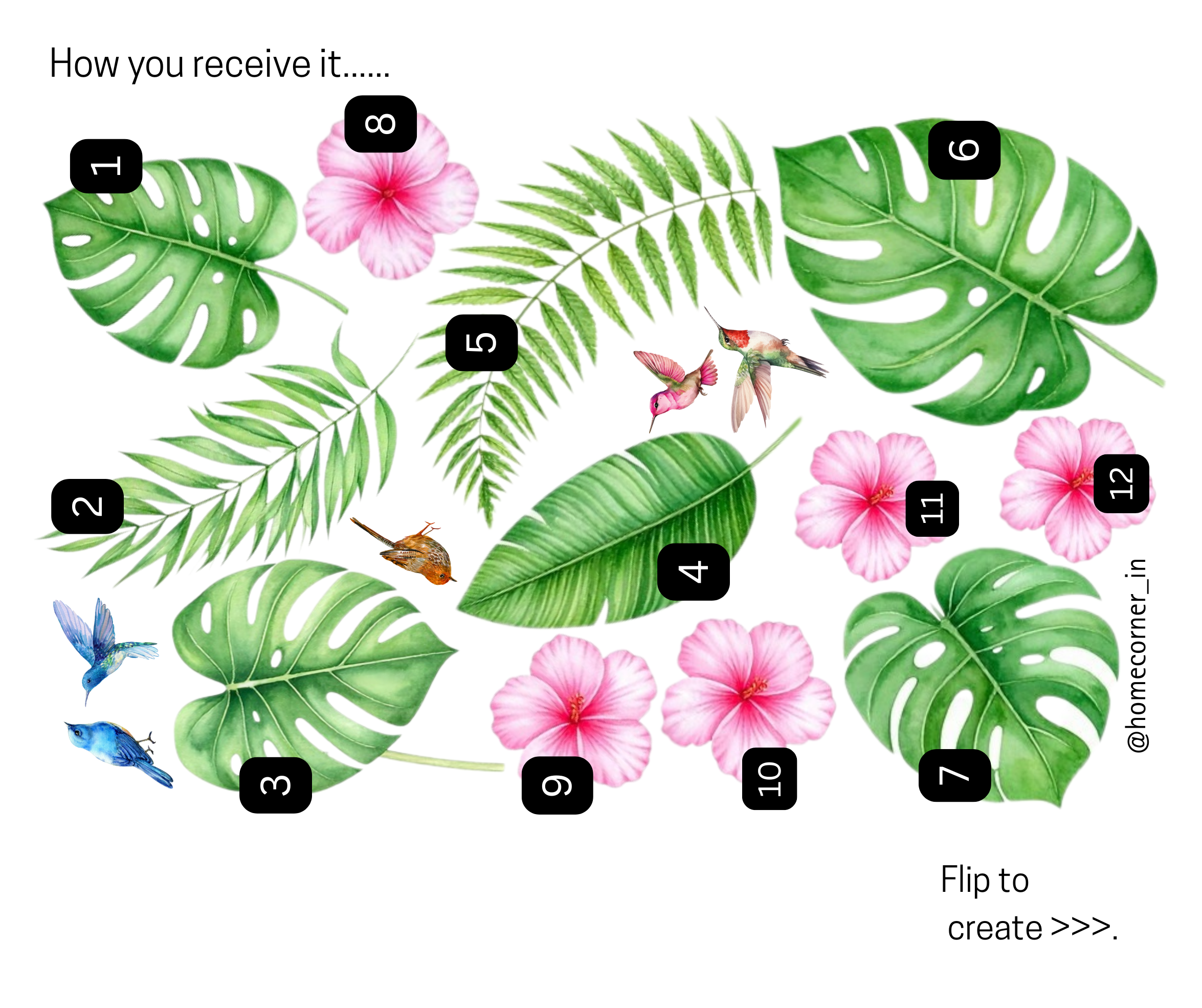 • 🌿 Set includes 5+ oversized tropical leaves, 5+ hibiscus flowers, multicolored birds, in varying shapes and shades.